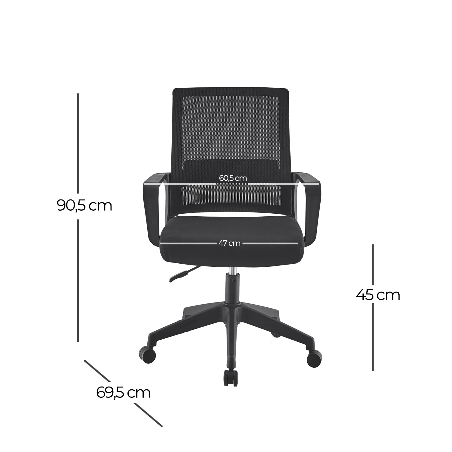 A Cadeira De Escritório Acton Preto é ideal para uso em escritórios, escritórios ou para o seu espaço de trabalho em casa. É equipado com um design realmente confortável graças à sua estrutura com reforço lombar e apoio de braço. É uma cadeira cujo quadro e apoio de braço é feito de polipropileno com acabamento preto. Suas pernas são polipropileno preto com rodas.O tecido do assento é feito de nylon com acabamento preto e o encosto conta com tecido de malha para permitir a transpiração adequada.Tem um sistema hidráulico ajustável de altura para ajustar o assento.A vantagem dessa cadeira confortável é que você pode estudar ou trabalhar por um longo período de tempo sem más posturas.Instruções de limpeza: use um pano macio ligeiramente umedecido, pré-experimentá-lo em uma área não visível do móvel. Não utilize produtos de amônia, solventes ou abrasivos.Medidas: Largura do assento: 47 cm, Altura para assento: 45cm, largura total: 60,5cm, Profundidade: 70cm e Altura: 91cmServido desmontado