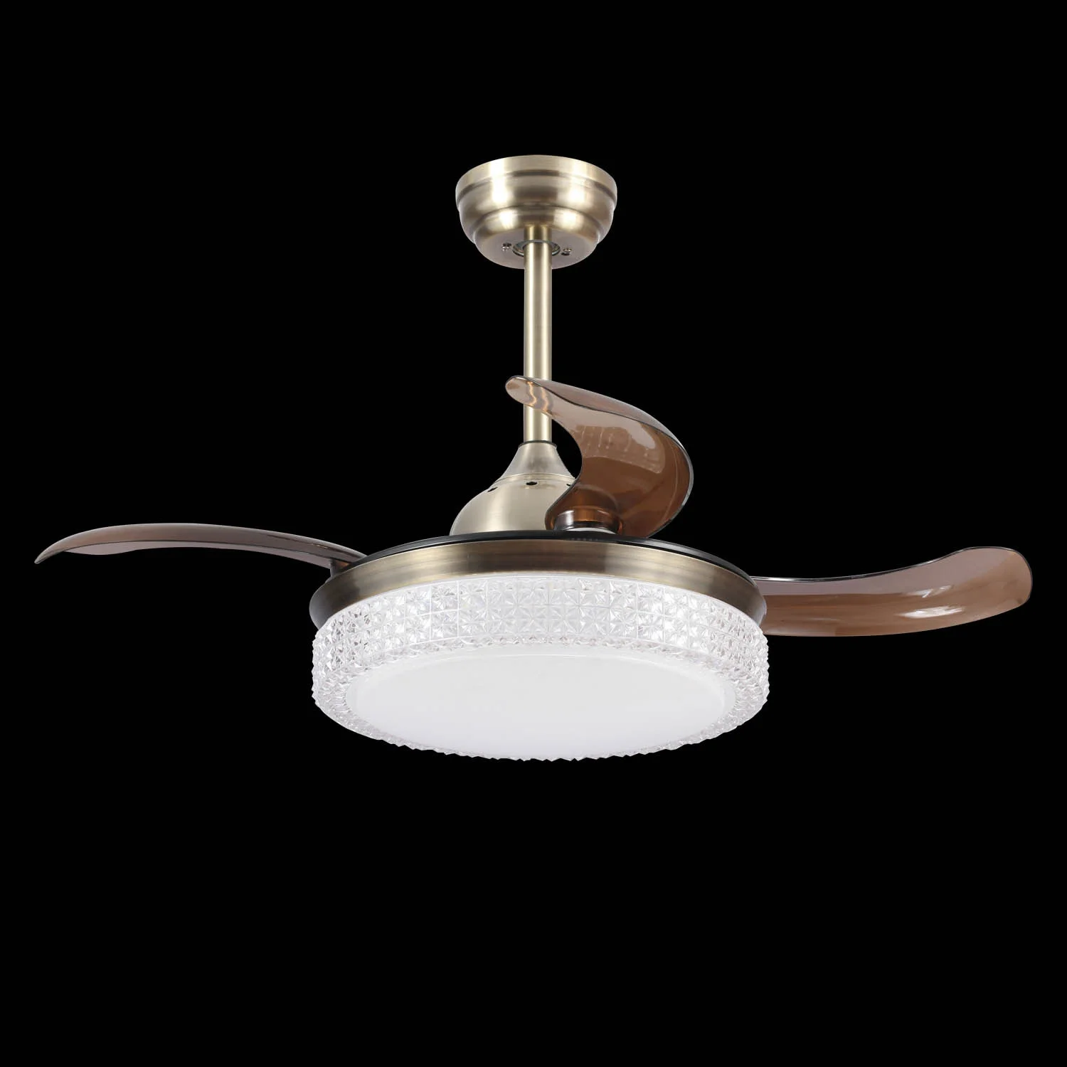 Trata-se de um ventilador de tecto com 4 lâminas dobráveis de 36 polegadas que são feitas de PVC fumado. O corpo é feito de alumínio com acabamento em couro e o seu difusor é feito de acrílico.