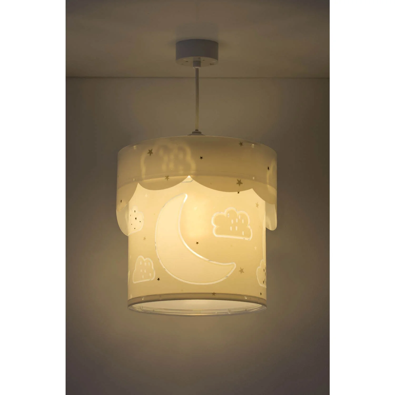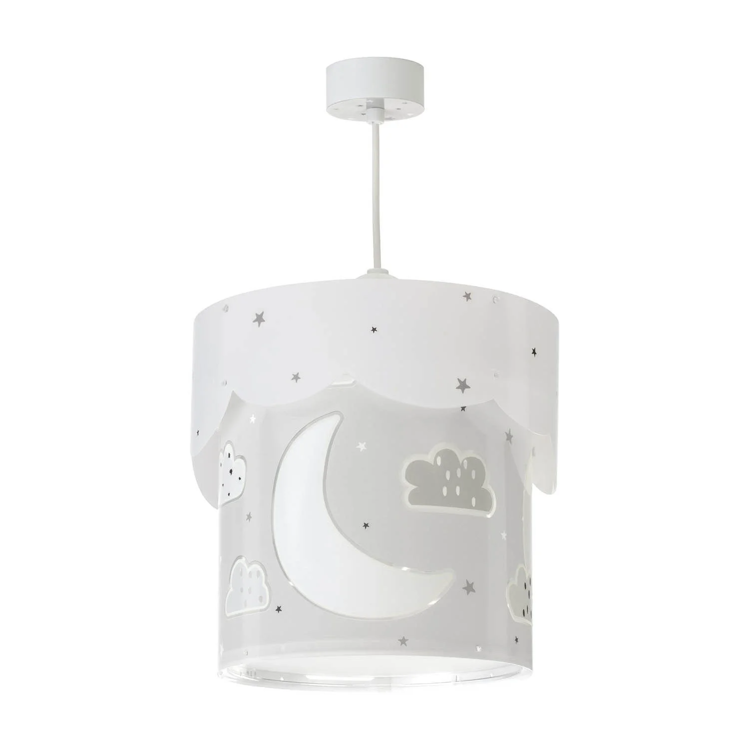 É uma lâmpada de teto infantil que pertence à maravilhosa coleção Lua e consiste em duas telas feitas de polipropileno.Um é branco e o outro é cinza. A tela branca é decorada com motivos de estrela e a tela cinza com uma lua e nuvens cercadas por estrelas.Funciona com uma lâmpada de bucha E27 máxima de 60W (lâmpada não incluída). Recomenda-se o uso de uma lâmpada LED.Alguns detalhes e contornos brilham no escuro decorativamente.Fabricado na Espanha