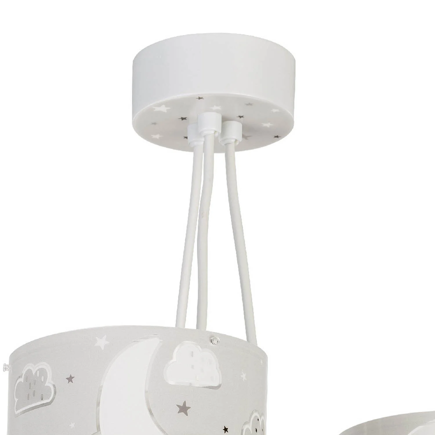 A Lâmpada Infantil lua 3-luz é composta de três telas feitas de polipropileno.Cada tela consiste em uma tela dupla, uma é branca e a outra é cinza.As telas brancas são decoradas com motivos estelares e as telas cinzas com luas e nuvens com estrelas ao seu redor.Trabalha com 3 lâmpadas de bucha E27 no máximo 60W (lâmpadas não incluídas). Recomenda-se o uso de lâmpadas LED.Alguns detalhes e contornos brilham no escuro decorativamente.Fabricado na Espanha