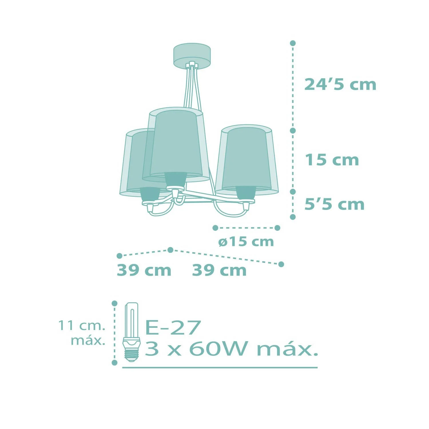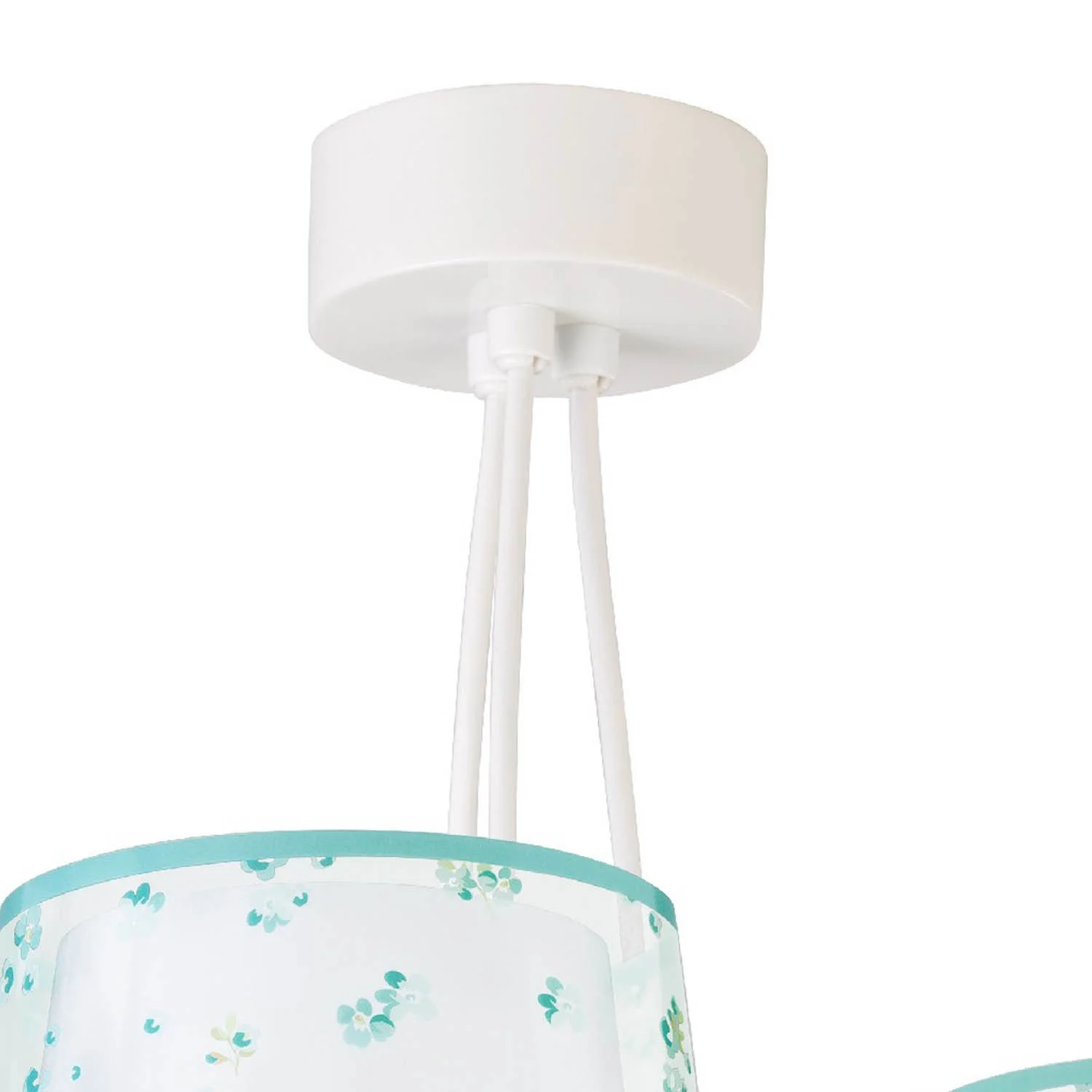 É uma lâmpada infantil de 3 luzes ideal para se vestir e iluminar quartos infantis. É composto por duas telas de polipropileno, um interior branco e outro transparente decorado com lindas flores verdes.Trabalha com 3 lâmpadas de bucha E27 no máximo 60W (lâmpadas não incluídas). Recomenda-se o uso de lâmpadas LED.Fabricado na Espanha