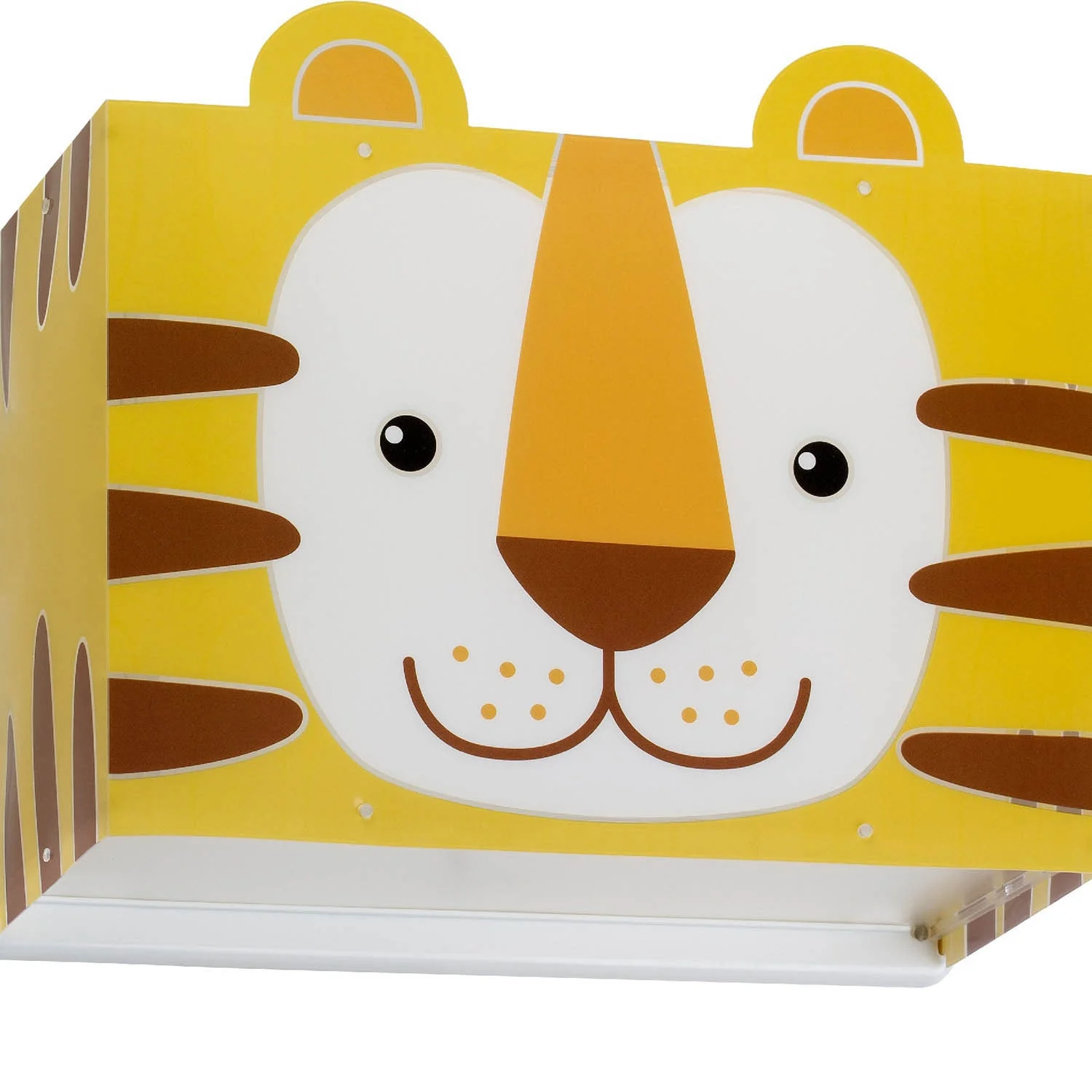 A tela é quadrada em forma com relevo em cima em laranja, o motivo dele é do rosto de um tigre sorridente, na parte superior das orelhas.
