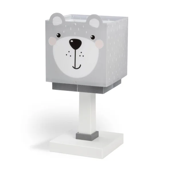 É uma lâmpada de mesa infantil muito bonita que pertence à coleção De Pequenos Amigos. Descubra toda a coleção em nossa loja online para obter iluminação divertida para o quarto do seu filho.A tela em forma quadrada é cinza com o motivo do rosto de um urso de pelúcia e em cima das orelhas.Funciona com uma lâmpada de bucha E14 máxima de 40W (lâmpada não incluída).Fabricado na Espanha