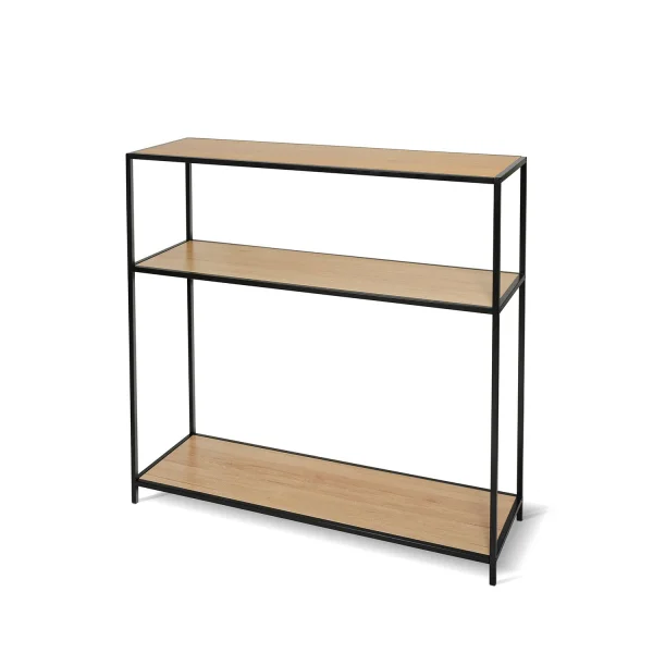 Esta é uma consola pertencente à colecção Swindon para utilização em qualquer tipo de espaço da sua casa como mobiliário auxiliar. A estrutura é feita de metal pintado de preto e as prateleiras são feitas de MDF coberto com contraplacado de cor de carvalho.