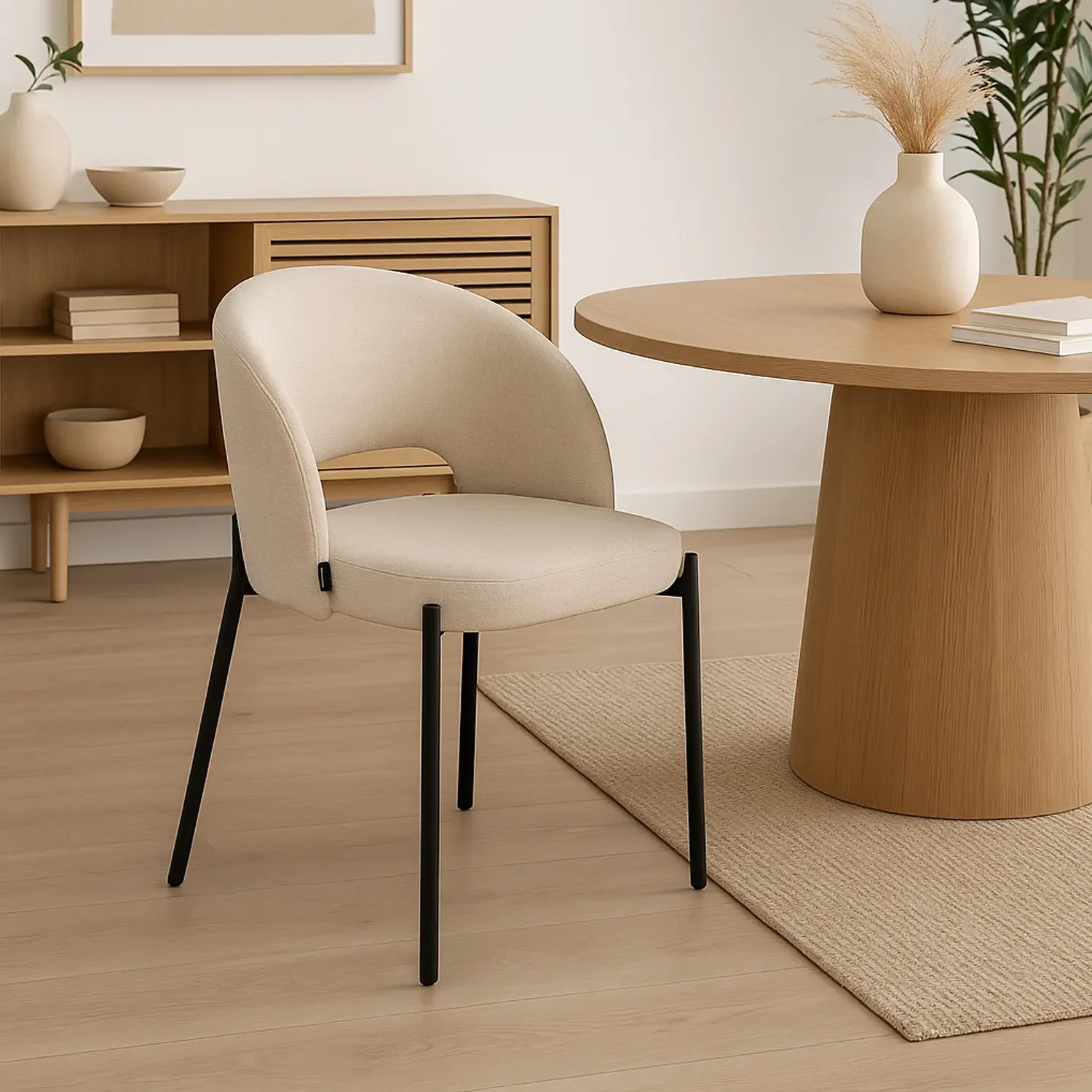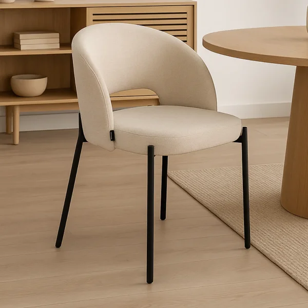 As pernas metálicas em preto não só adicionam um contraste visual atraente, mas também garantem uma estrutura robusta e durável. Esta cadeira é ideal tanto para a sala de jantar como para um escritório elegante, combinando funcionalidade com um design contemporâneo.