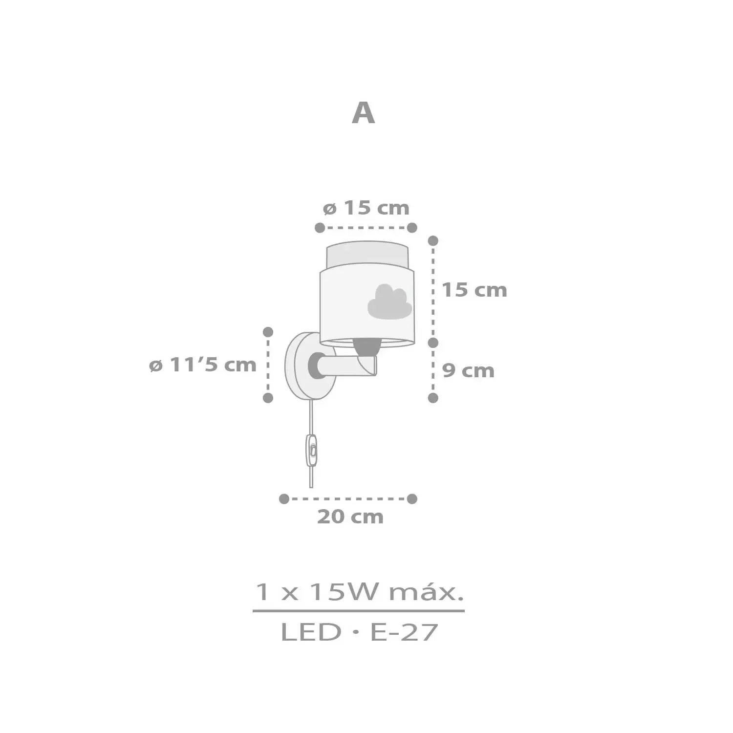 Este aplique apresenta um design atrativo que inclui três pequenas nuvens de cor cinza, que brilham suavemente no escuro, oferecendo um ambiente acolhedor durante a noite. Fabricado em polipropileno, é leve e seguro, ideal para quartos de crianças. As suas dimensões são compactas: tem uma altura de 24 cm, um diâmetro do ecrã de 15 cm, uma largura de 20 cm e uma base que se fixa à parede com um diâmetro de 11,5 cm.