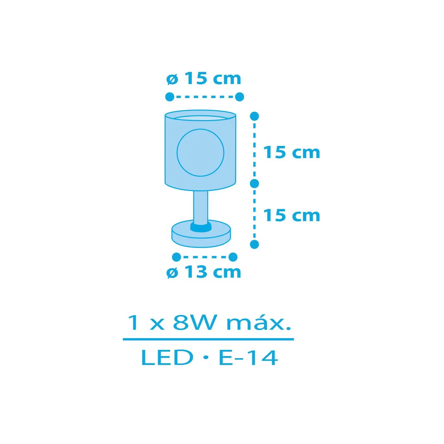 O candeeiro é feito em polipropileno, sendo seguro e resistente para o uso diário. Com um casquilho E14 compatível com lâmpadas de até 8W, proporciona uma iluminação adequada para ler histórias ou relaxar antes de dormir, acrescentando um toque de fantasia ao ambiente.