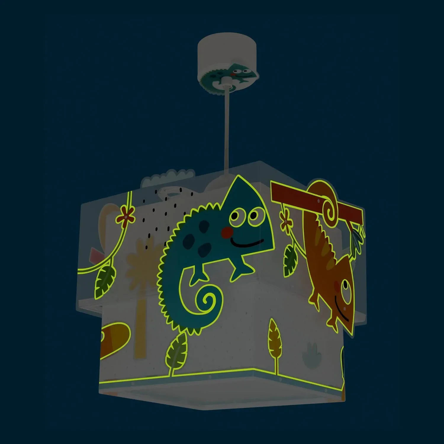 Esta divertida suspensão infantil apresenta um design cheio de vida, que mostra um simpático camaleão e uma variedade de animais da selva. Não só fornece luz, como também enriquece o ambiente das crianças. A sua capacidade de brilhar no escuro é uma característica fundamental, pois cria uma atmosfera acolhedora e segura para que os pequenos se sintam tranquilos ao dormir.