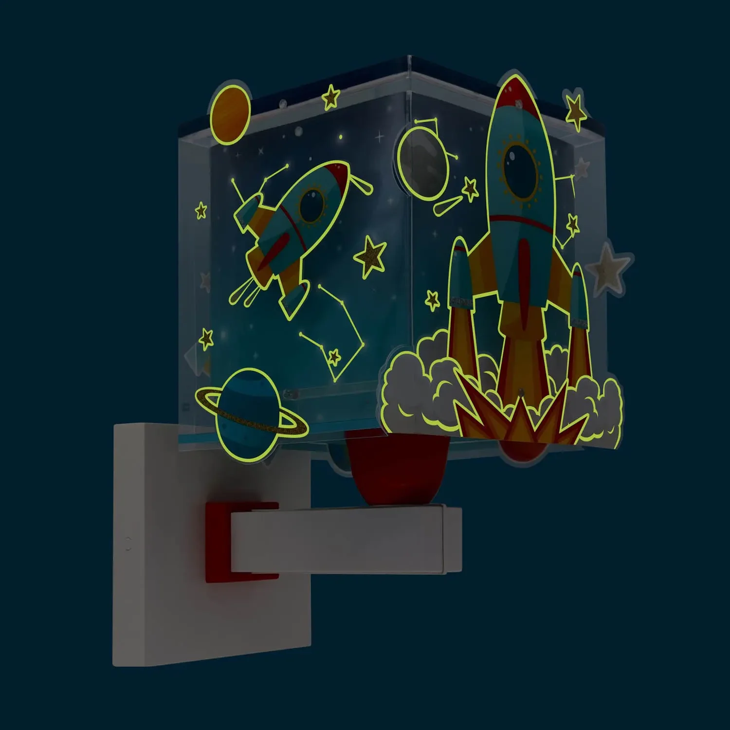 • Design espacial: Representa um foguete e estrelas que brilham no escuro.