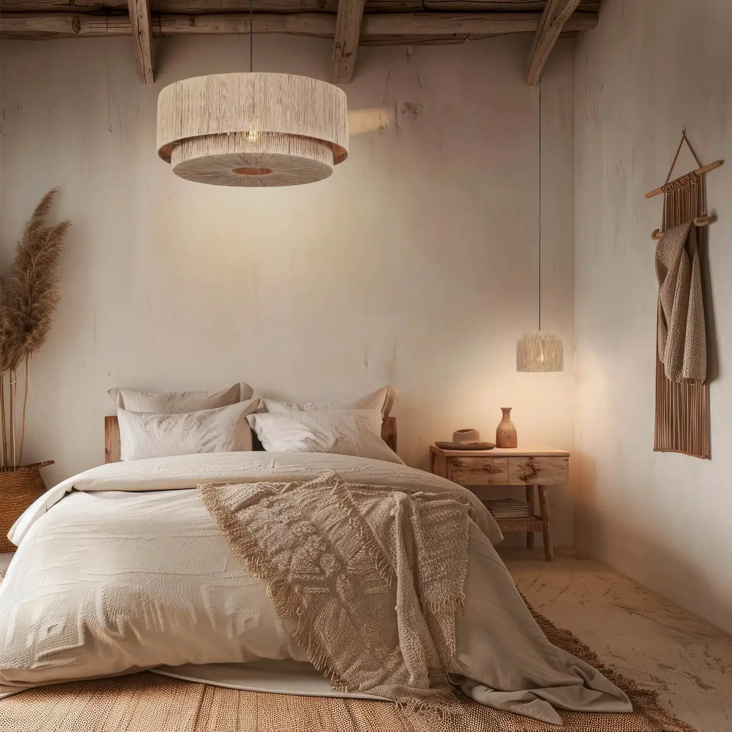 O candeeiro de teto Leiko juta natural acrescenta calor e textura ao ambiente, criando uma iluminação natural e acolhedora. O seu design intemporal adapta-se a estilos nórdicos, mediterrânicos ou contemporâneos, e a juta oferece uma difusão de luz suave, perfeita para ambientes relaxados.