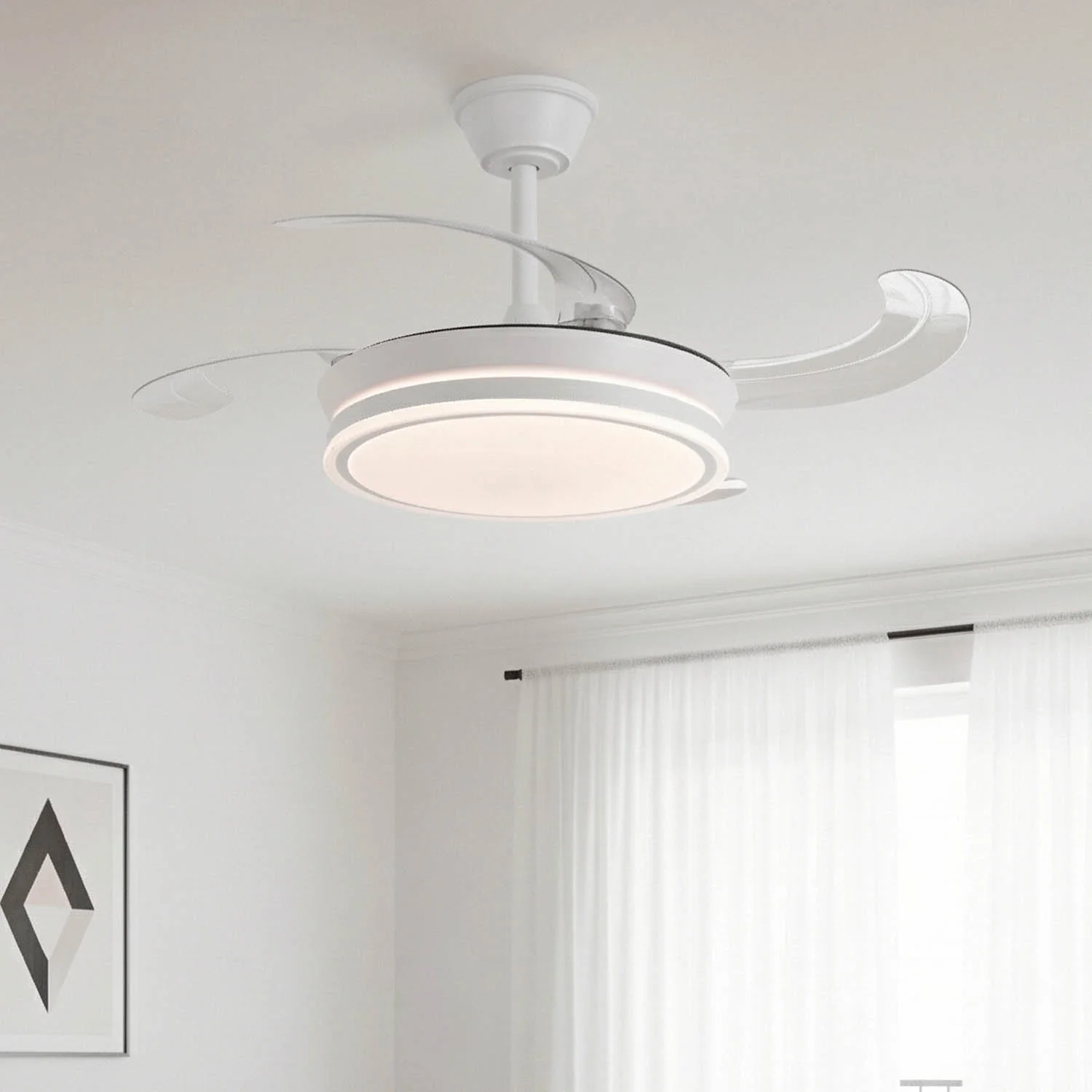 O Ventilador de Teto LED 40W Regulável Dariel destaca-se pelo seu design inovador com pás dobráveis em PC transparente que se ocultam quando não estão em uso, oferecendo a aparência de uma lâmpada moderna. A sua estrutura em alumínio branco e difusor acrílico garantem resistência e distribuição homogénea da luz.