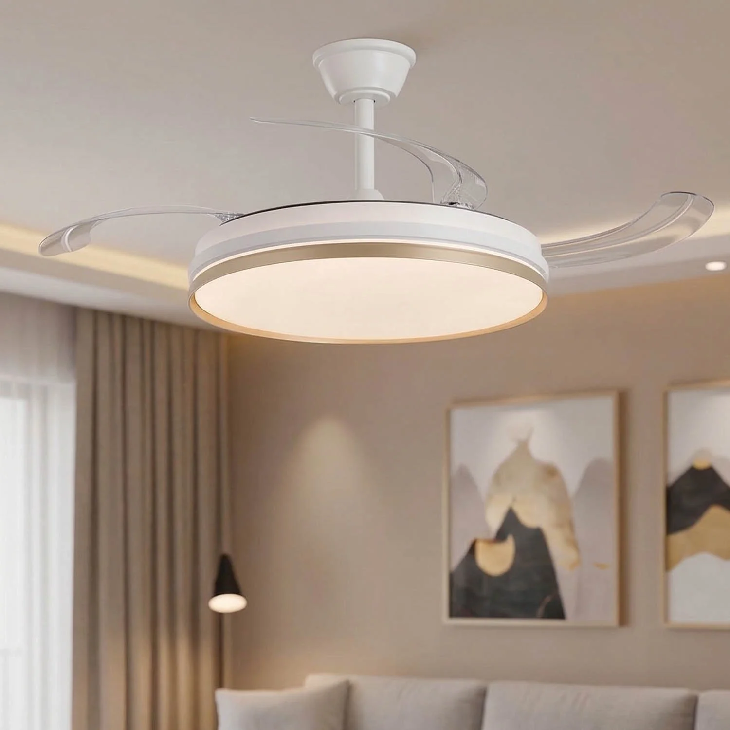 O Ventilador de Teto LED 55W Regulável Aurelio mantém um perfil discreto quando as pás retráteis não estão em uso, enquanto a luz LED ajustável cria o ambiente perfeito em qualquer momento do dia. O difusor em acrílico branco e dourado distribui a luz de forma uniforme e suave, evitando encandeamento, e o design em alumínio garante durabilidade e resistência.